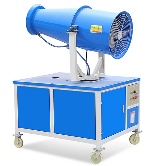 遠(yuǎn)程噴霧炮是根據(jù)風(fēng)送原理,先使用高壓泵、微細(xì)霧化噴嘴將水霧化,再利用風(fēng)機(jī)風(fēng)量和風(fēng)壓將霧化后的水霧送到較遠(yuǎn)距離,使得水霧到達(dá)較遠(yuǎn)距離同時能夠覆蓋更大面積,水霧與粉塵凝結(jié)后降落,從而達(dá)到降塵目的。