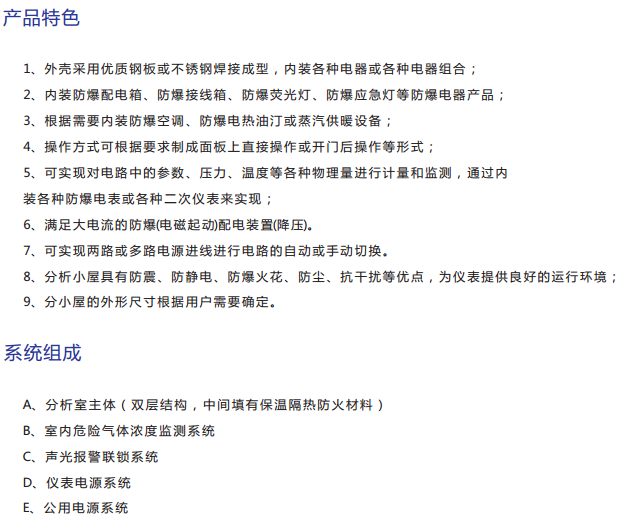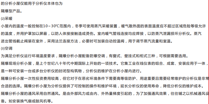 · 防爆分析小屋采用全鋼鐵式框架結(jié)構(gòu),將分析儀表、控制單元組裝在小屋內(nèi)