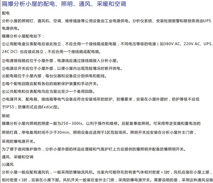 · ,樣品預(yù)處理及載氣、標(biāo)準(zhǔn)氣、驅(qū)動氣安裝在小屋外圍。取樣探頭及前級減壓站就近安裝在工藝管線旁。小屋內(nèi)安裝有防爆空調(diào),防爆電熱汀或蒸汽供暖設(shè)備(可選),可調(diào)節(jié)室內(nèi)溫度。配電系統(tǒng)為管線系統(tǒng),配有防爆配電箱、防爆接線箱等電氣。照明系統(tǒng)采用防爆熒光燈并帶防爆應(yīng)急熒光燈。小屋內(nèi)還配 備有通風(fēng)、換氣、過濾裝置,可定時通風(fēng)換氣,保持室內(nèi)空氣新鮮。小屋內(nèi)還配備有報警連鎖盤(含氣體傳感器及控制器)及聲光報警燈, 當(dāng)有可燃/有毒氣體泄漏時,聲光報警燈會發(fā)出報警,以保護人身安全。